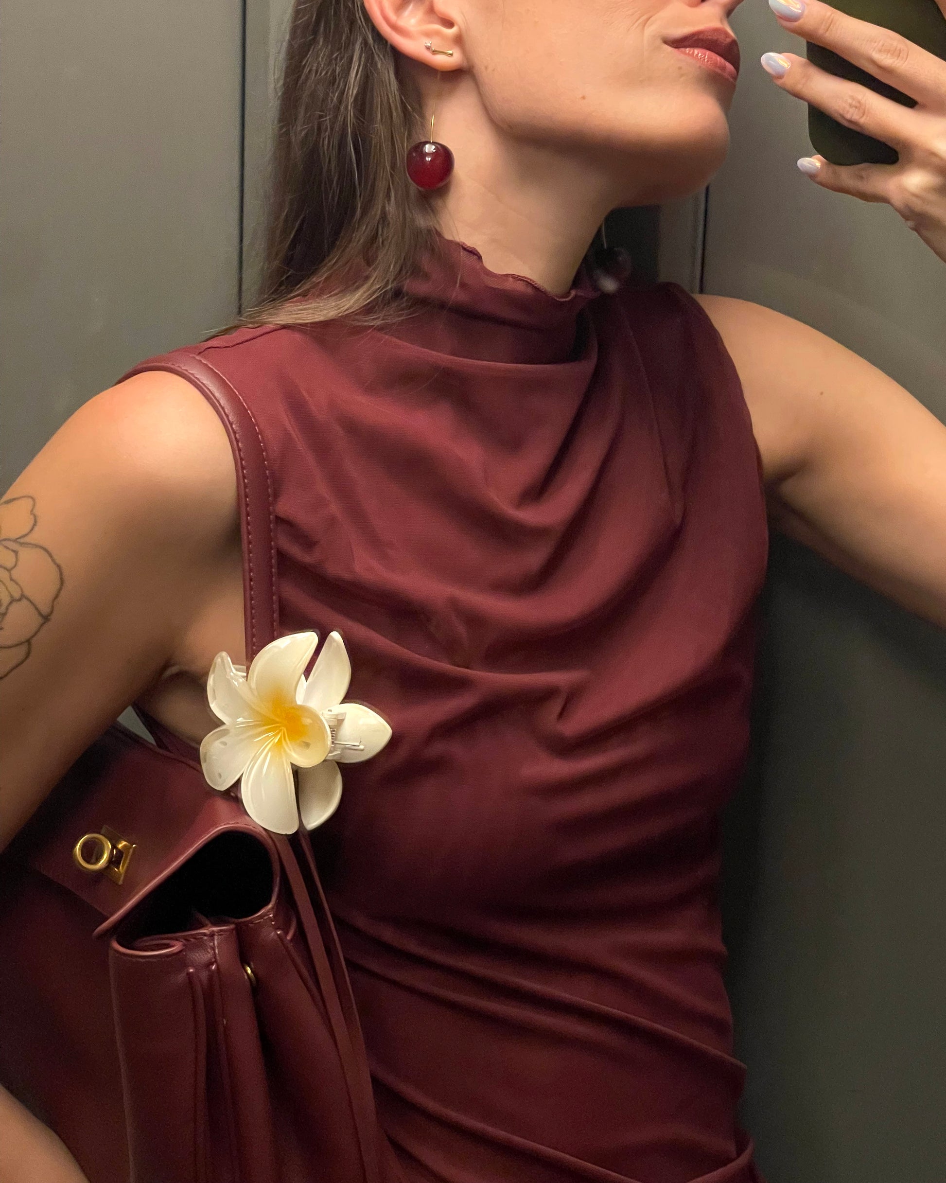 Mesh Top in Burgundy. High neck and gathers on the bust. One size. Discover how to styled it on IG!